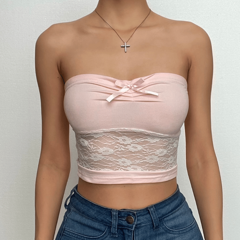 Lace patchwork sweetheart neck bowknot backless tube crop top