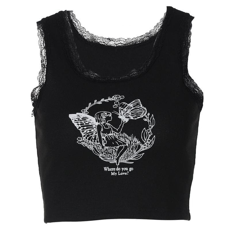 Lace hem butterfly pattern contrast sleeveless ribbed crop top