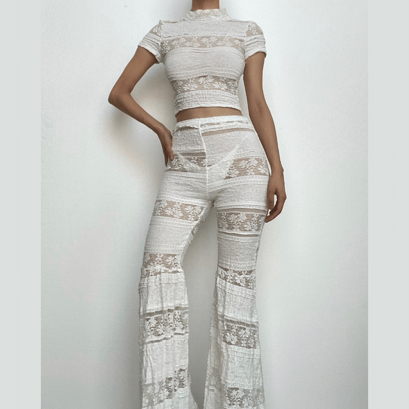 Lace see through solid high neck short sleeve flared pant set
