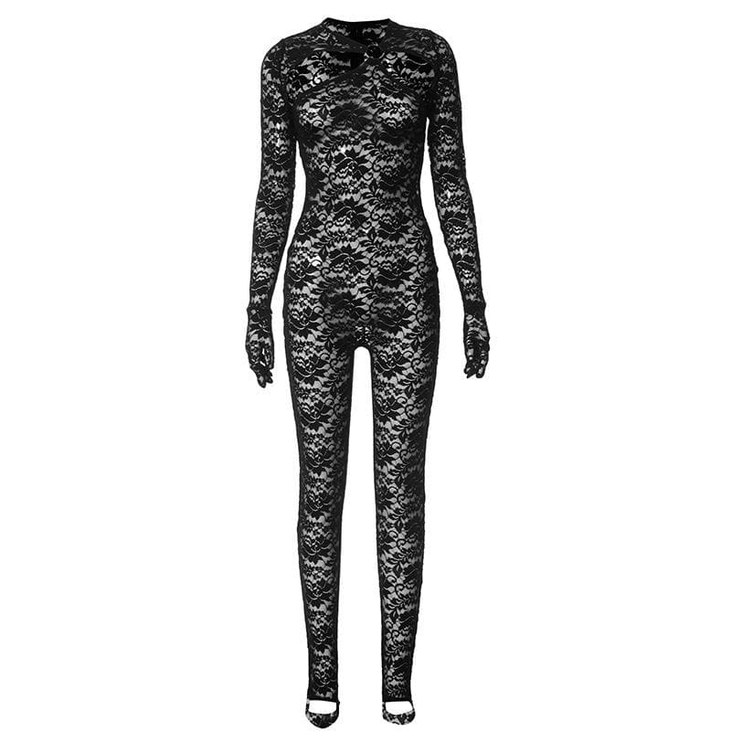 Lace see through zip-up solid long sleeve gloves hollow out jumpsuit