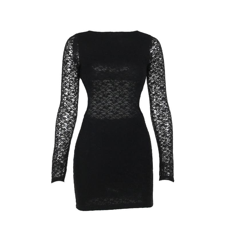 Lace solid long sleeve backless hollow out self tie mini dress