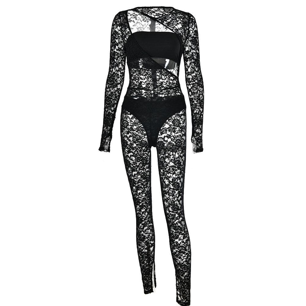 Lace solid long sleeve hollow out tube gloves zip-up jumpsuit set