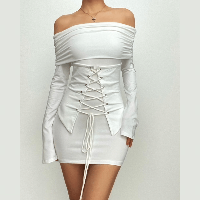 Lace up long sleeve off shoulder ruched solid mini dress