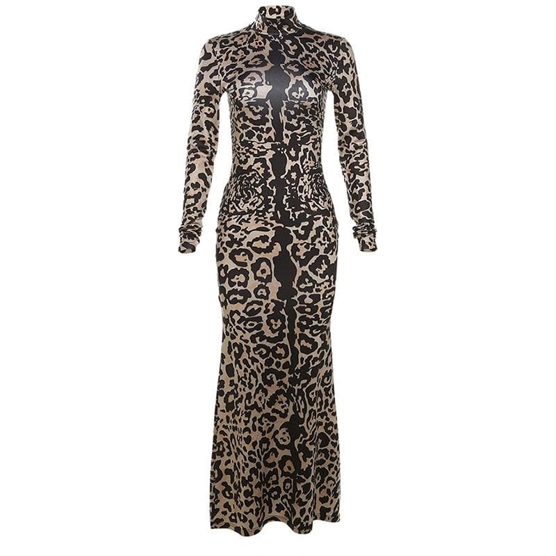 Leopard print contrast high neck long sleeve maxi dress