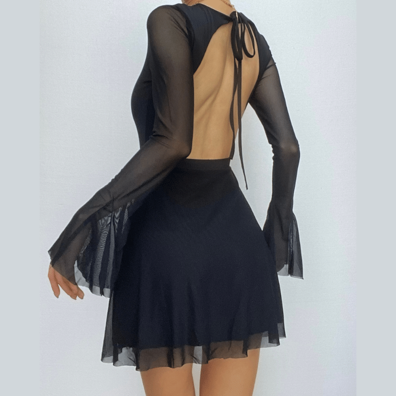 Long flared sleeve crewneck self tie mesh backless mini dress
