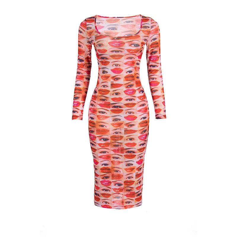 Long sleeve abstract u neck sheer mesh contrast midi dress