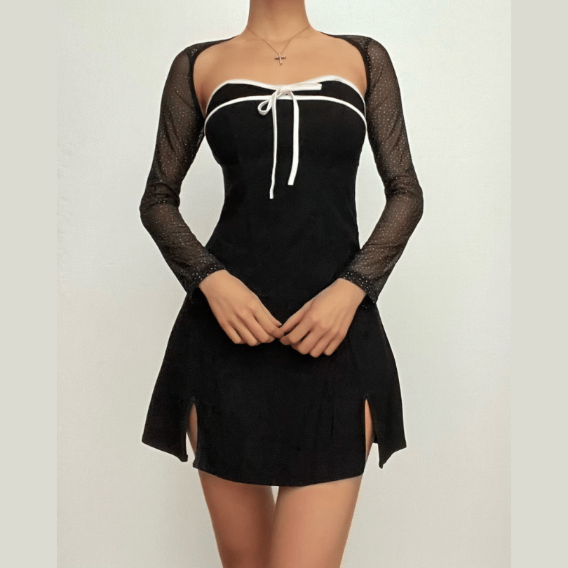 Long sleeve bowknot mesh shrug slit zip-up glitter 2 piece mini dress