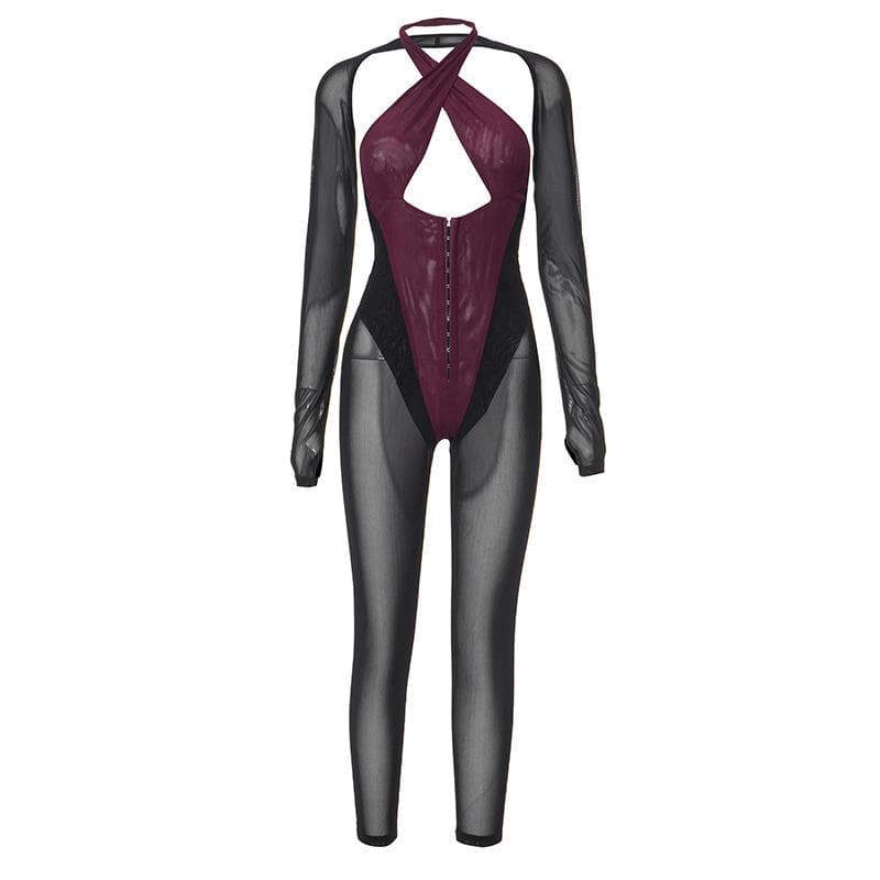 Long sleeve button halter cross front shrug mesh backless 2 piece jumpsuit