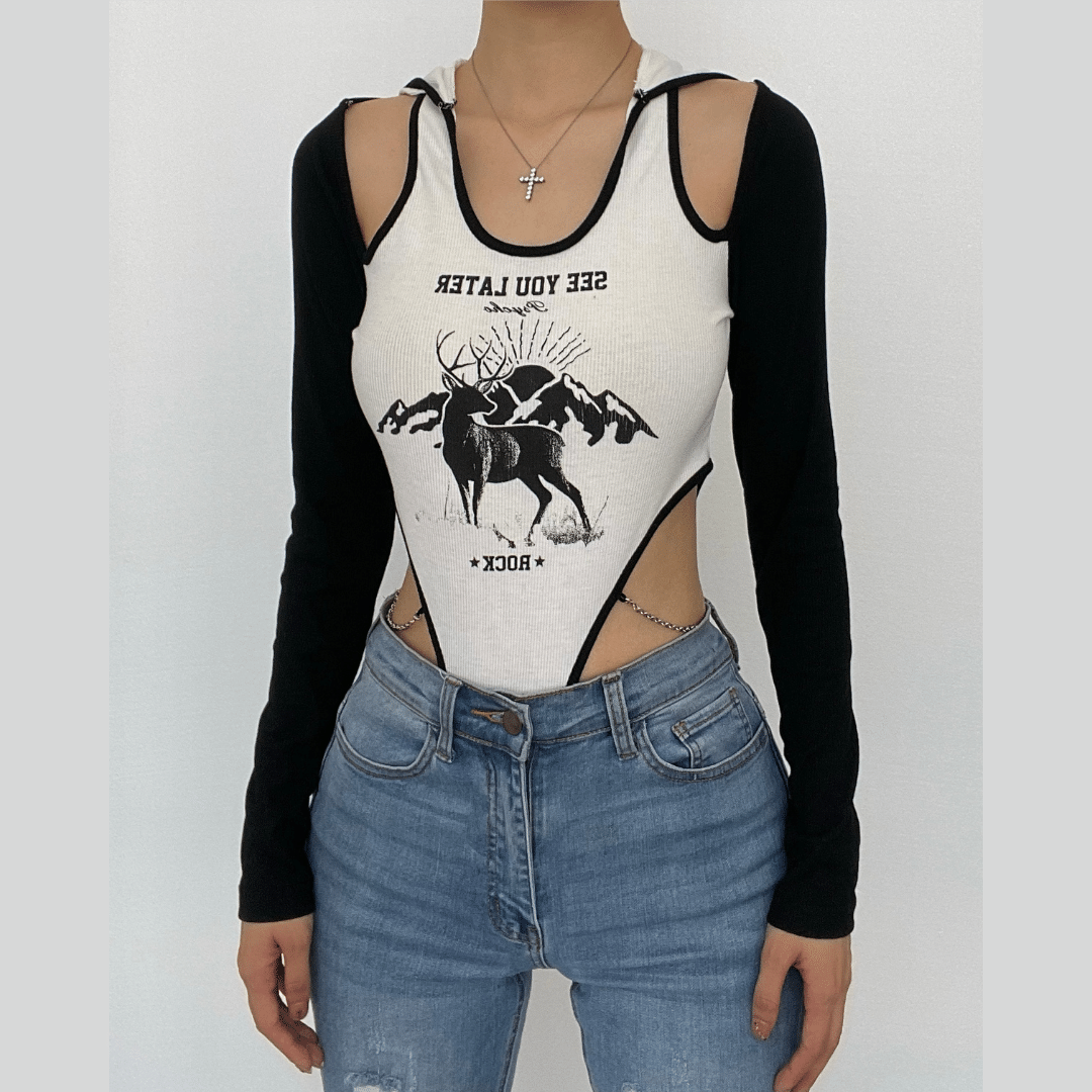 Long sleeve contrast hollow out abstract metal chain button hoodie bodysuit