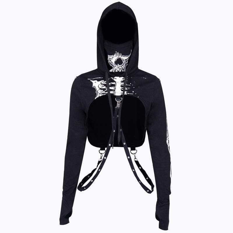 Long sleeve hoodie skeleton print buckle gloves contrast shrug top