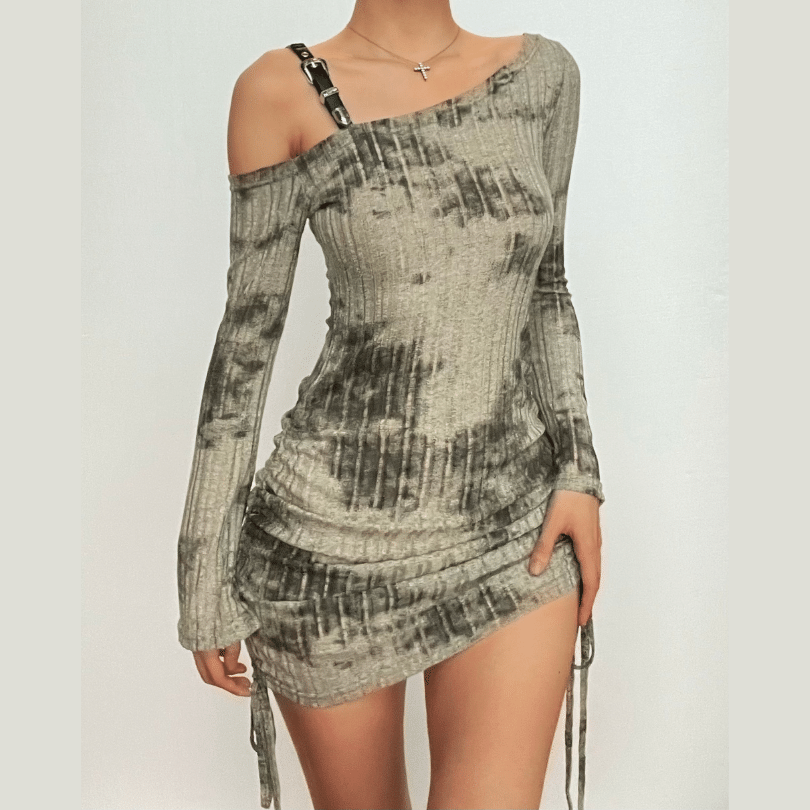 Long sleeve tie dye off shoulder drawstring ruched ribbed buckle top