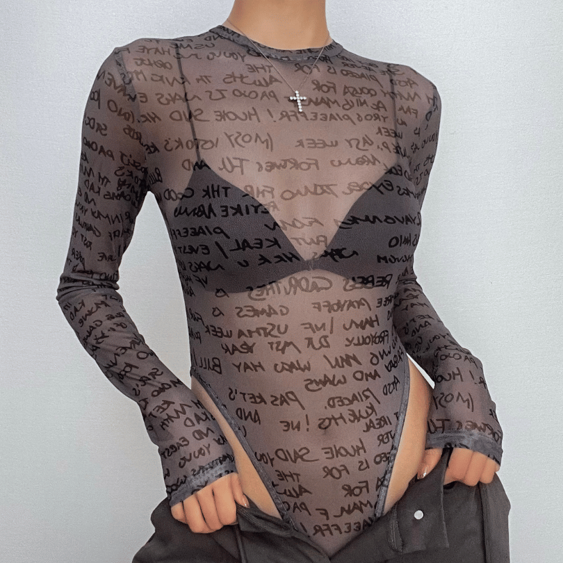 Long sleeve letter print sheer mesh see through crewneck bodysuit