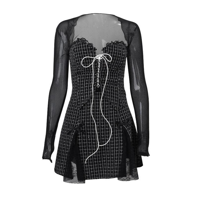 Long sleeve mesh plaid bowknot lace up shrug 2 piece mini dress
