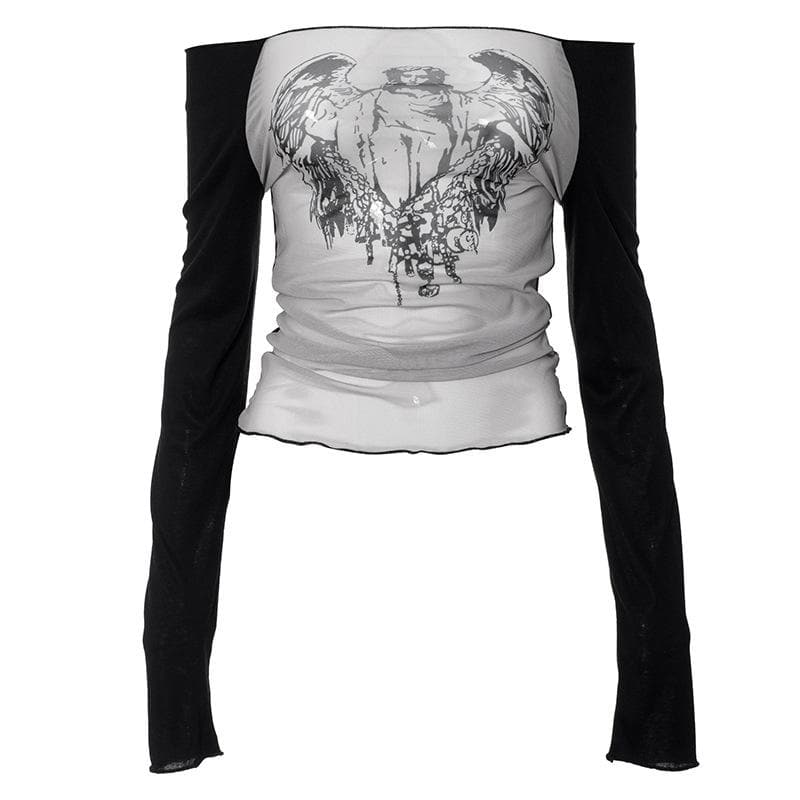 Long sleeve off shoulder ruched sheer mesh Jesus print top