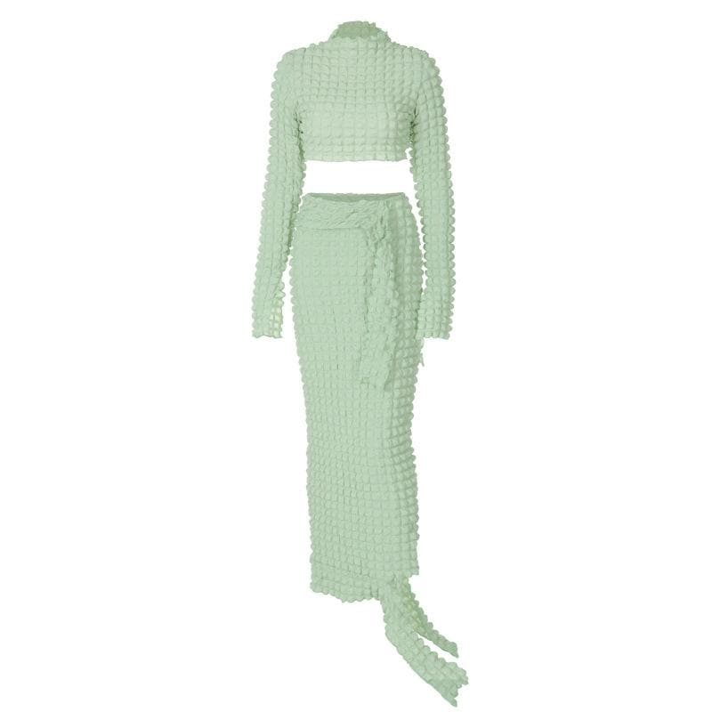 Long sleeve waffle high neck ruffle slit maxi skirt set