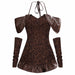 This leopard dress featuring a fitted mini silhouette. soft brown animal print fabric. and a ruffled satin hem. Comes with off-shoulder satin sleeves and matching fingerless gloves for a full dramatic Y2K look