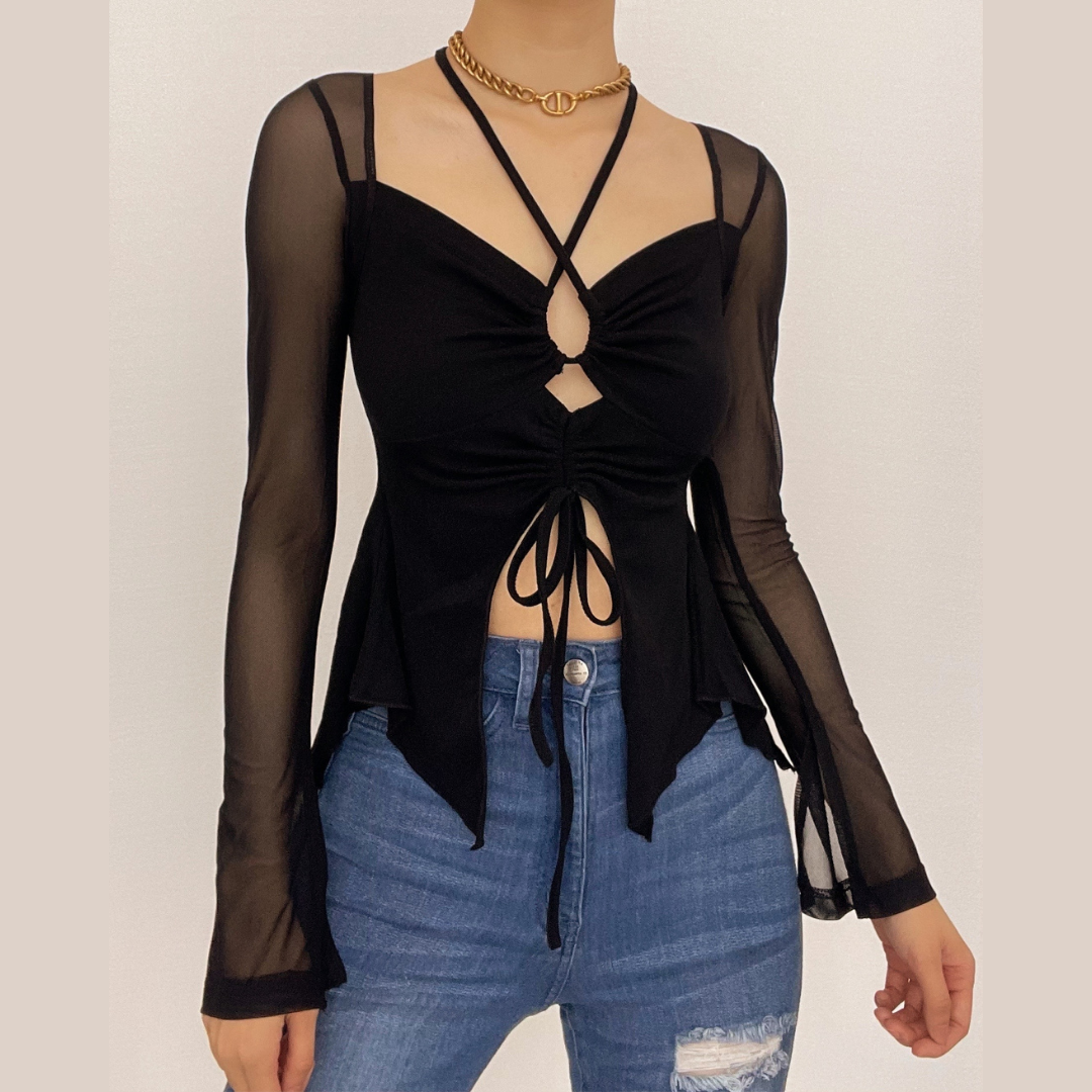 Mesh hollow out slit drawstring long sleeve halter self tie crop top
