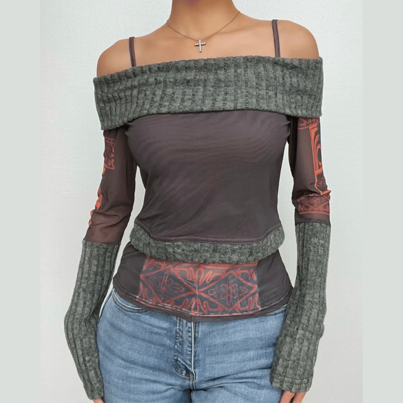 Mesh patchwork knitted contrast off shoulder long sleeve cami top