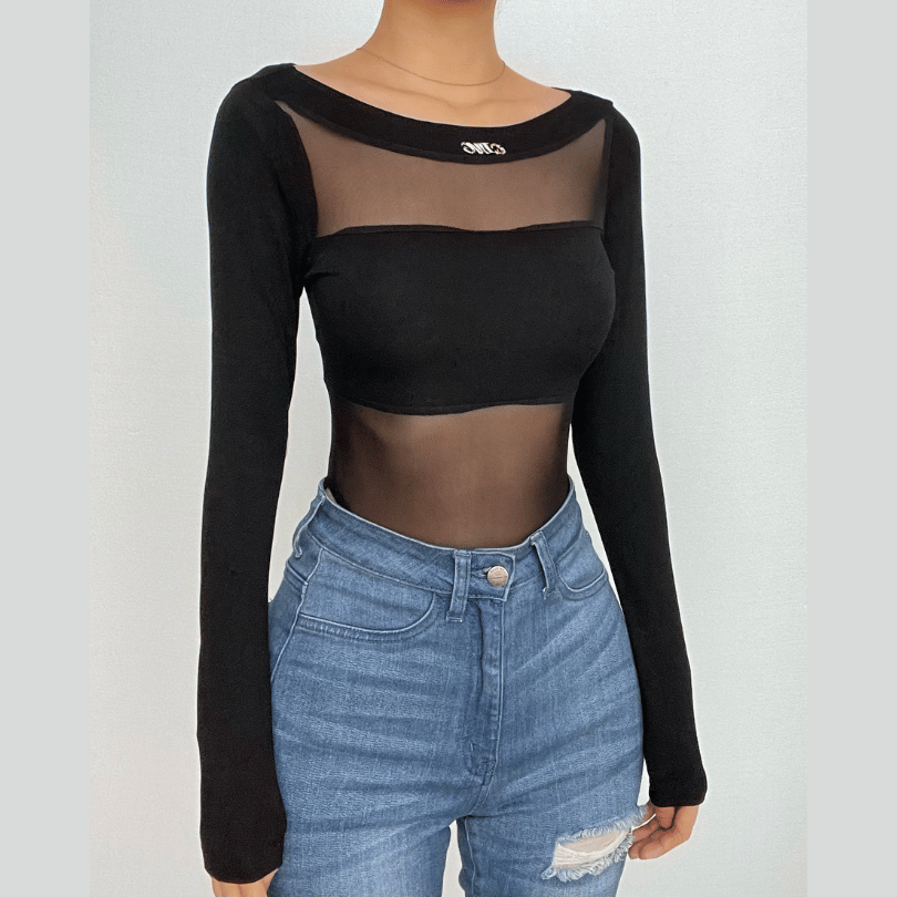 Mesh patchwork long sleeve solid round neck bodysuit