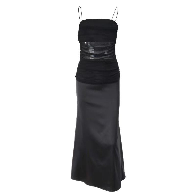 Mesh patchwork zip-up solid backless ruched cami midi dress