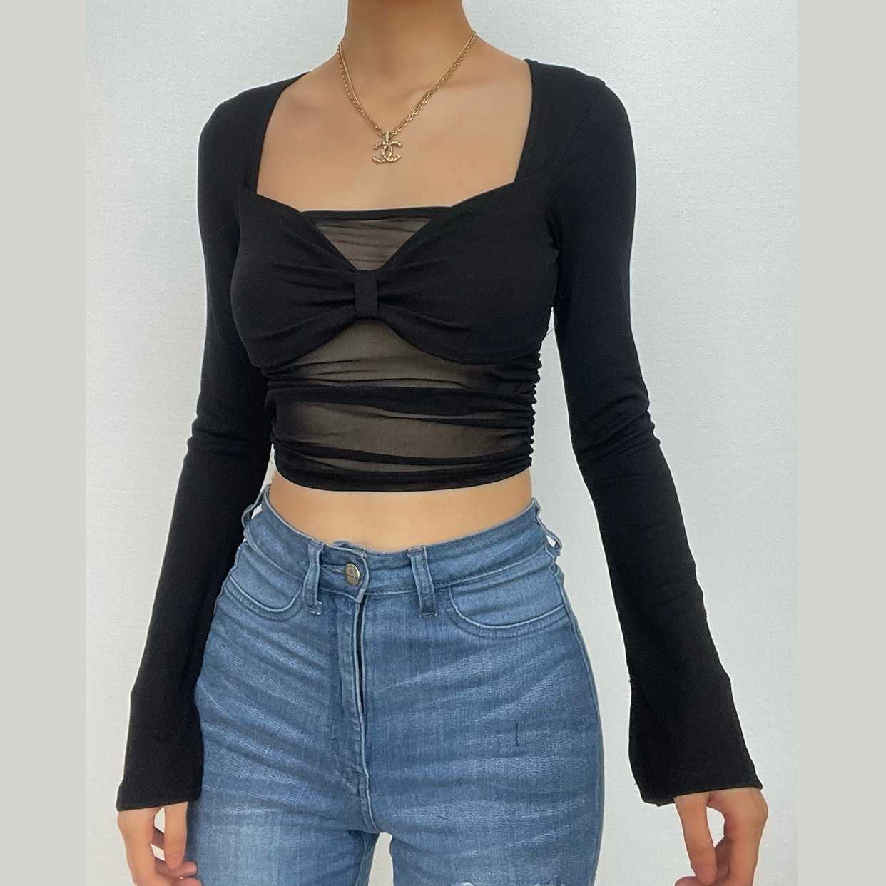 Mesh solid long flared sleeve ruched low cut crop top