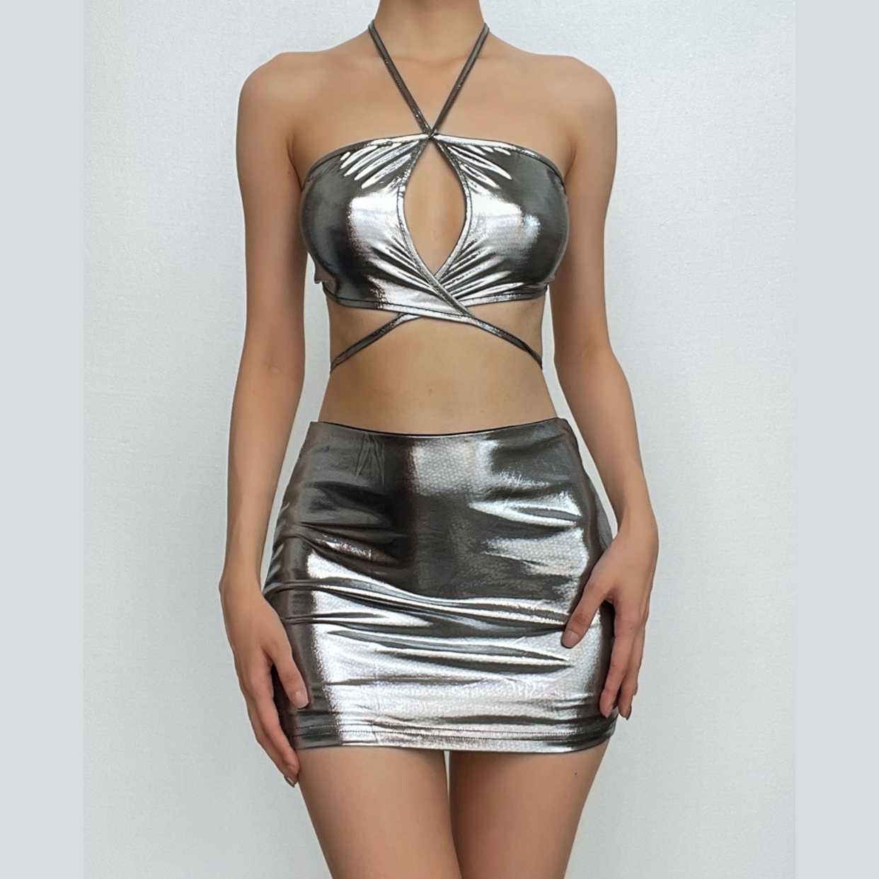Metallic backless cross front hollow out halter self tie mini skirt set