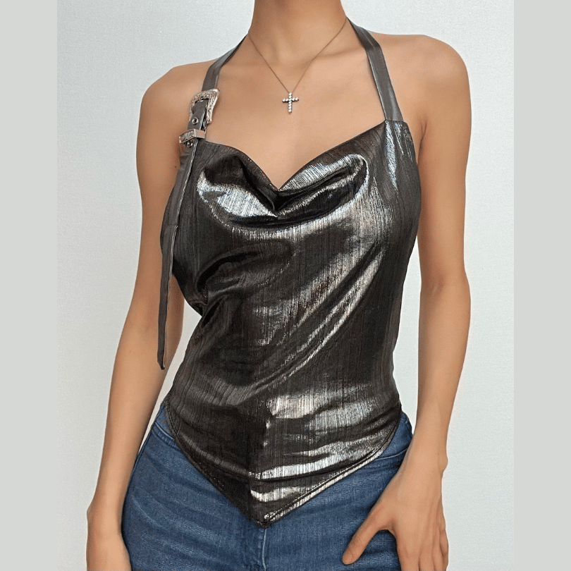 Metallic cowl neck buckle halter ruched backless top