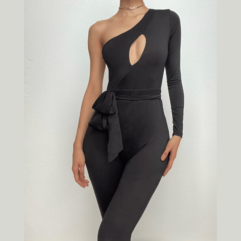 One shoulder hollow out irregular solid zip-up jumpsuit