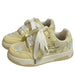These cute yellow sneakers have a vegan leather upper with an aesthetic star design. a low ankle rise and a lace up in front /p>