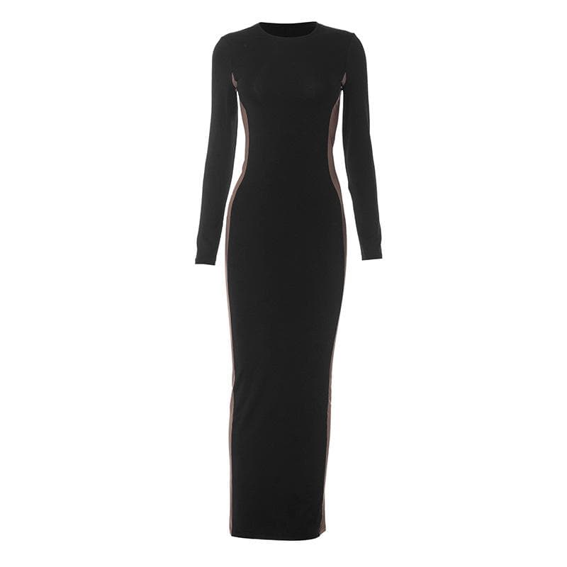 Patchwork contrast long sleeve slit crewneck maxi dress