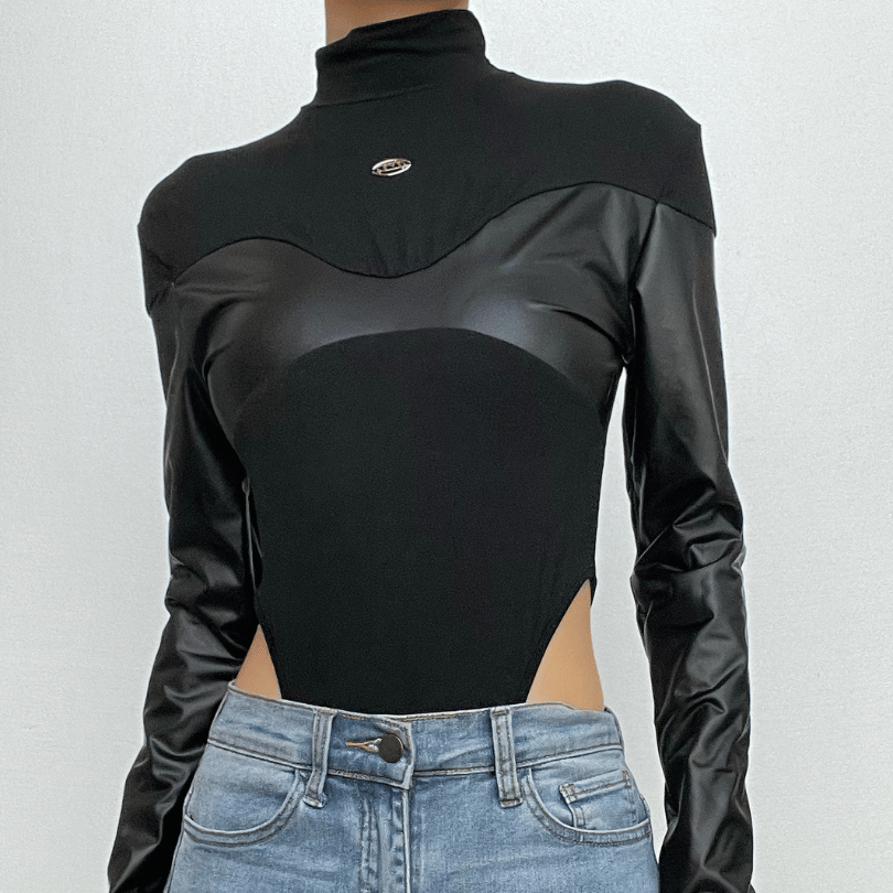 Patchwork high neck long sleeve PU leather bodysuit