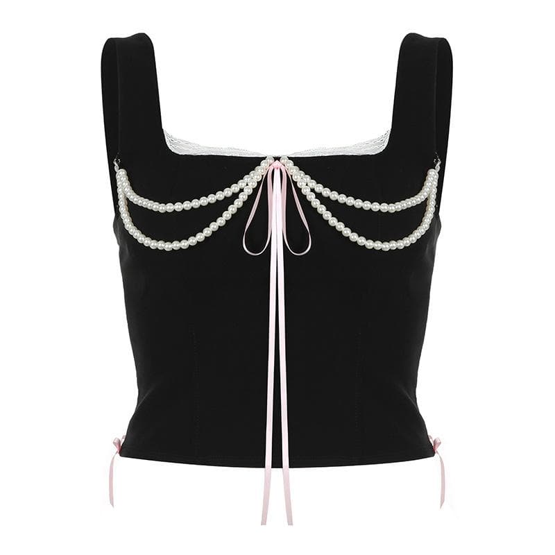 Pearl chain square neck lace hem sleeveless lace up crop top