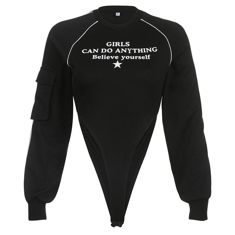 Pocket letter print long sleeve crewneck contrast bodysuit