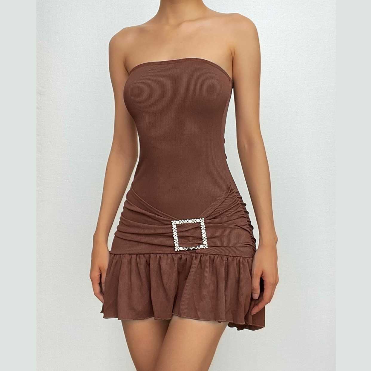 Ribbed buckle ruched ruffle solid backless tube mini dress