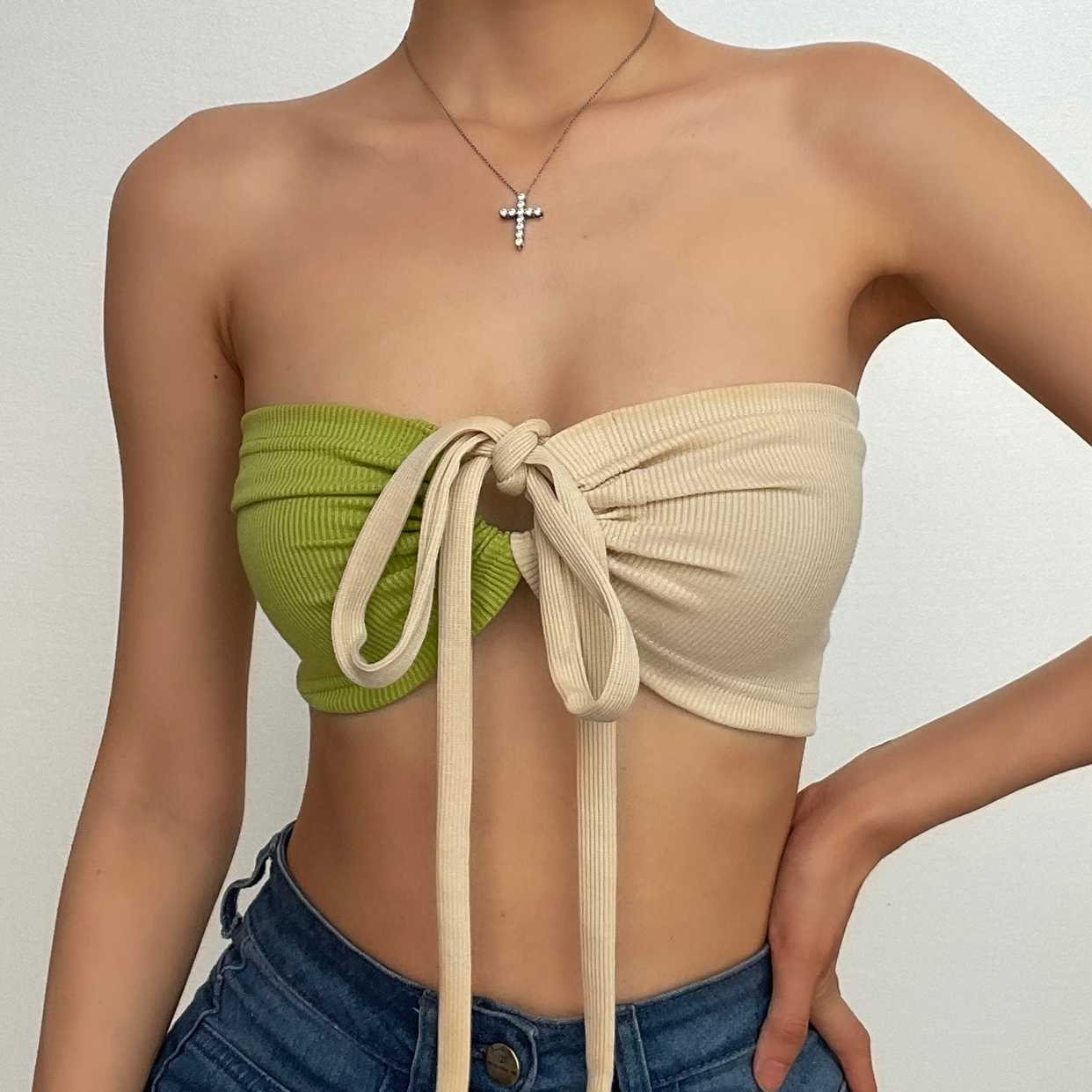 Ribbed contrast halter cross front drawstring backless crop top - Final Sale