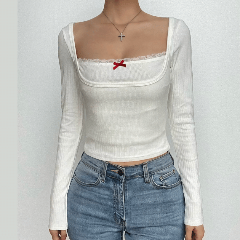 Ribbed patchwork square neck lace hem long sleeve crop top