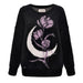 Fuzzy black sweater featuring an aesthetic purple rose and moon graphic
