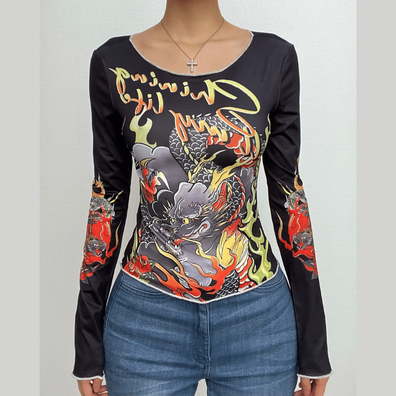 Round neck dragon print long sleeve contrast ruffle top