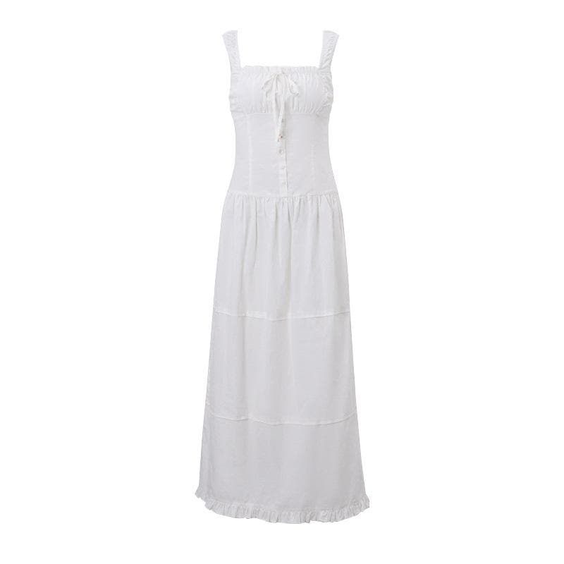 Ruched button square neck sleeveless smocked ruffle midi dress