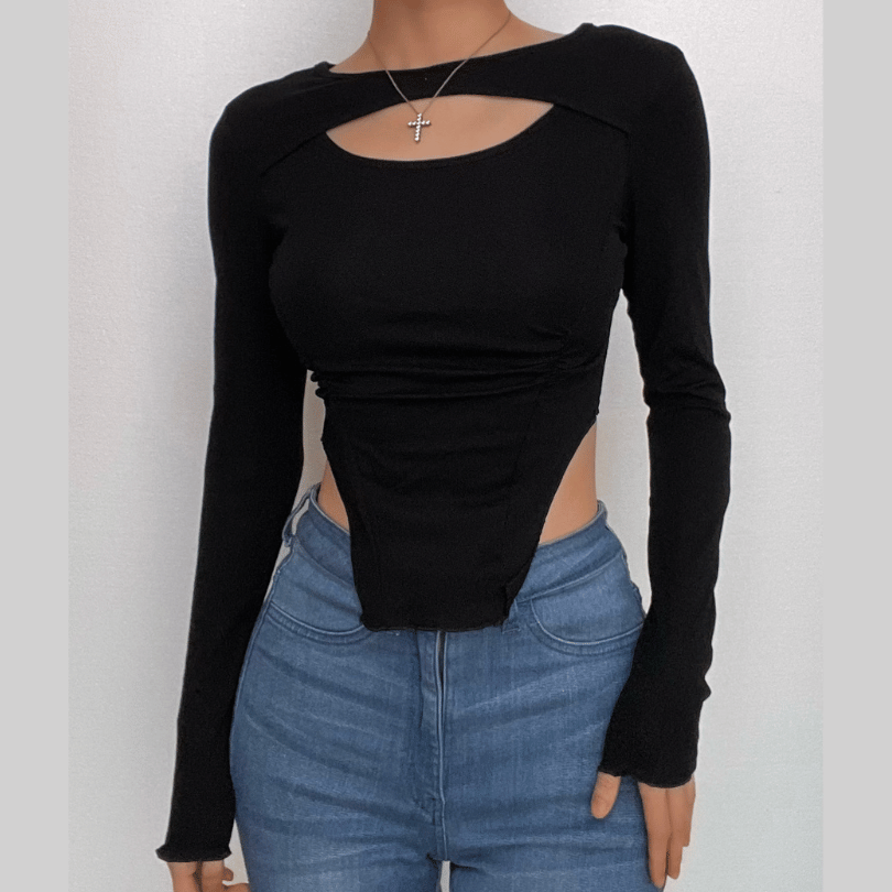Ruched hollow out long sleeve solid patchwork crop top