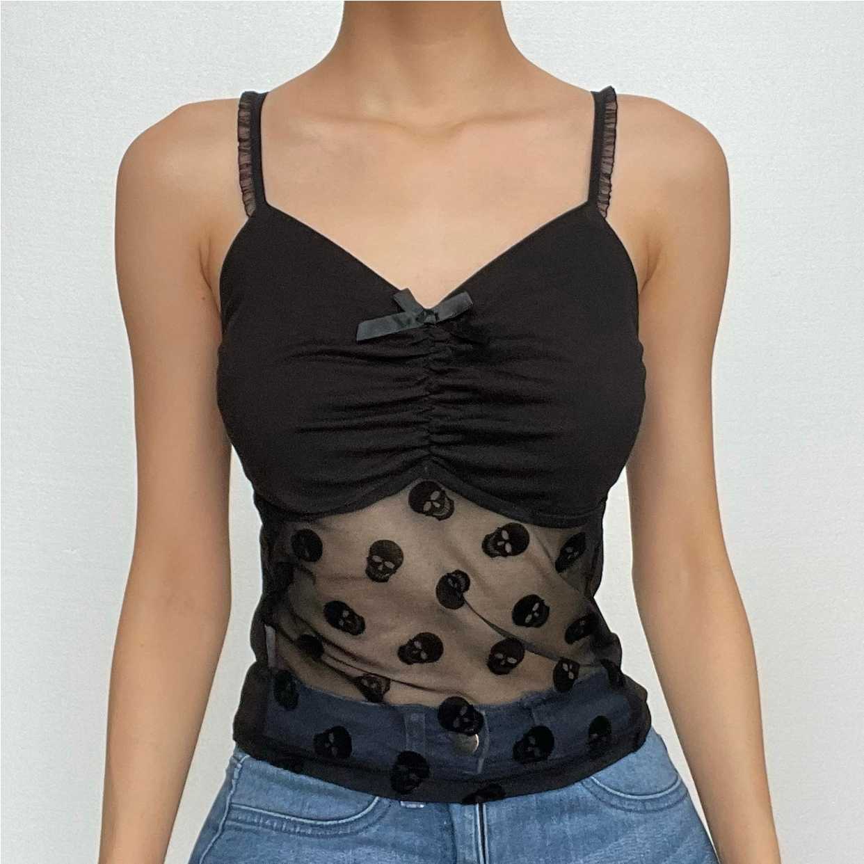 Ruched mesh backless v neck solid cami top