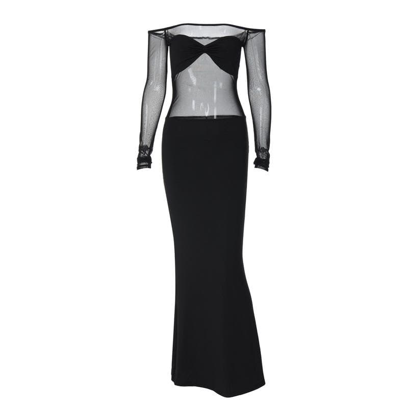 Ruched mesh patchwork off shoulder long sleeve slit maxi dress
