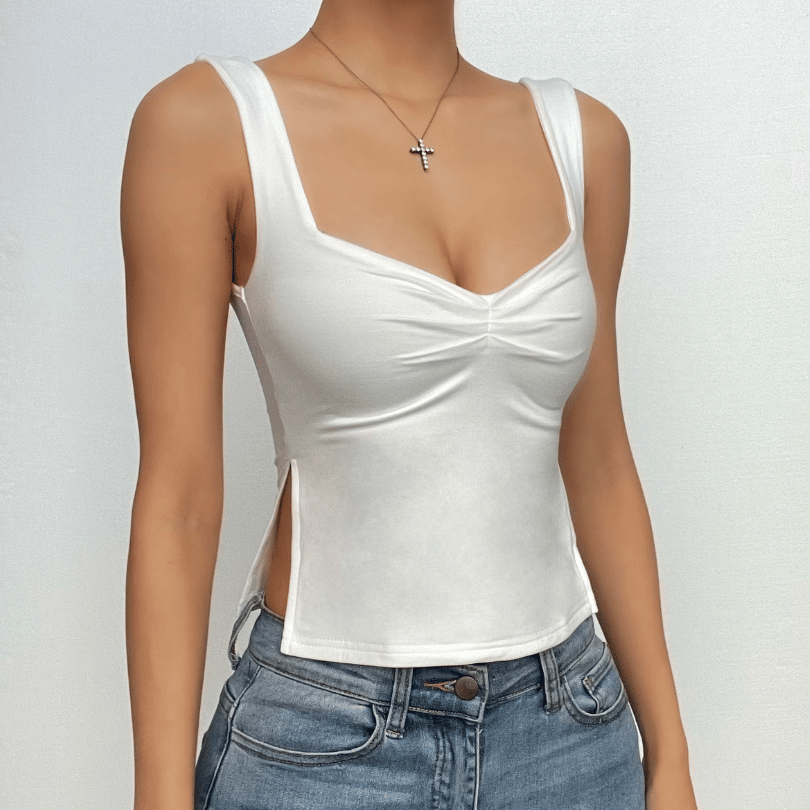 Ruched sleeveless slit solid v neck backless top