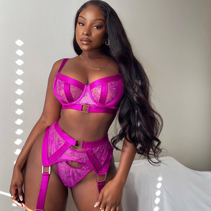 • Matching bra and thong set with adjustable suspender belt and leg straps