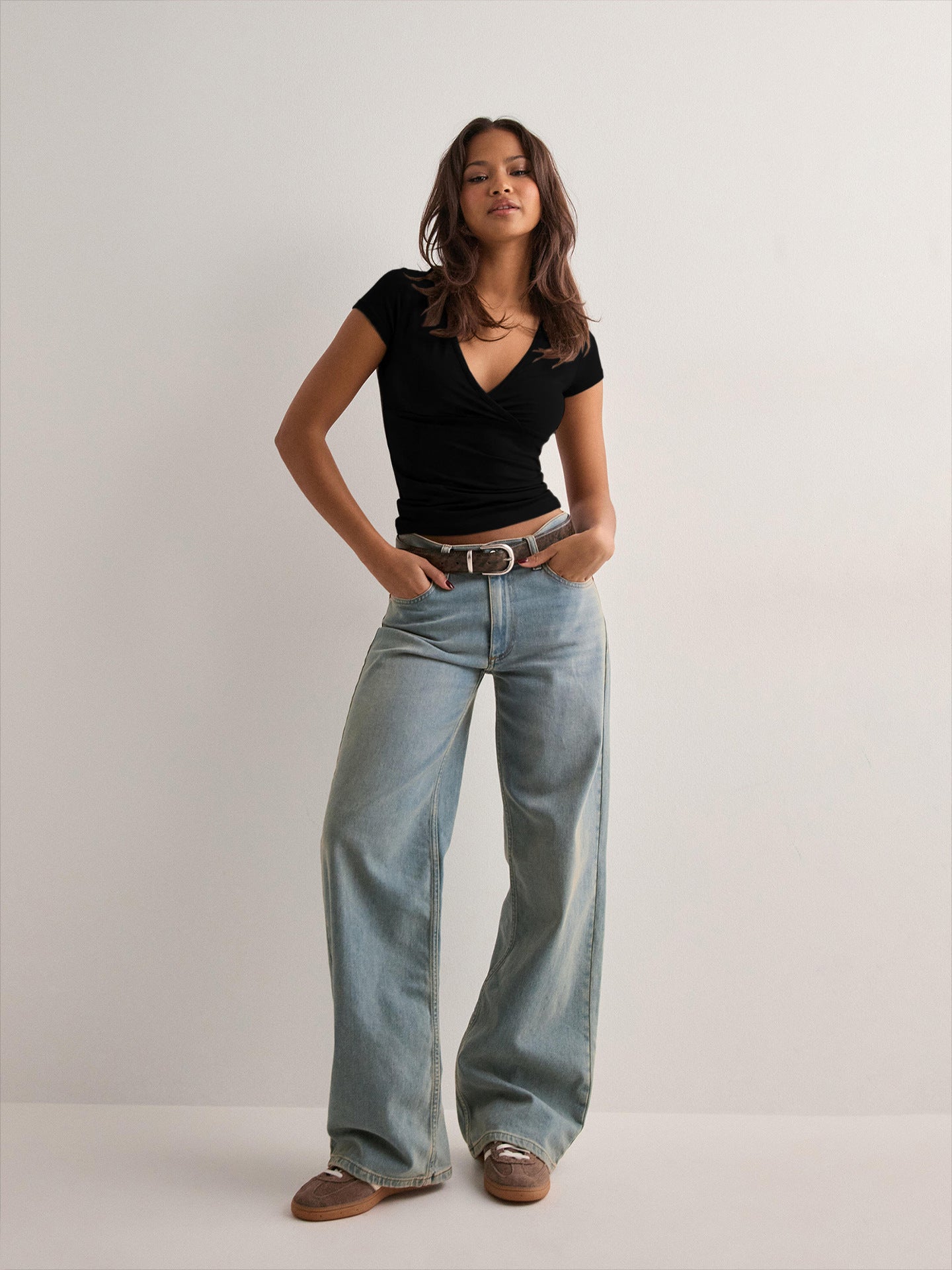 Cute meets stylish to create your new go-to,e Black Ribbed Surplice Short Sleeve Bodysuit! Stretchy ribbed knit fabric shapes this bodysuit with a surplice neckline (and back) and short sleeves. A fitted silhouette features gathering at the sides before ending at thong bottoms with double snap closures.