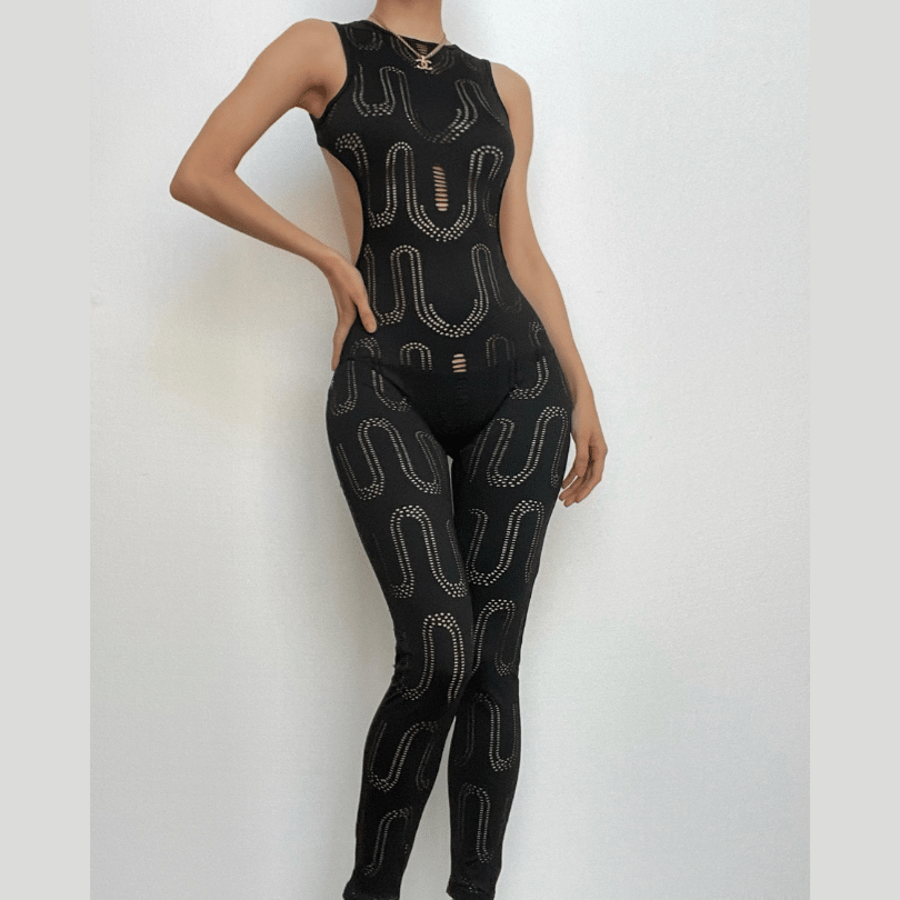 Sleeveless backless solid crewneck hollow out jumpsuit