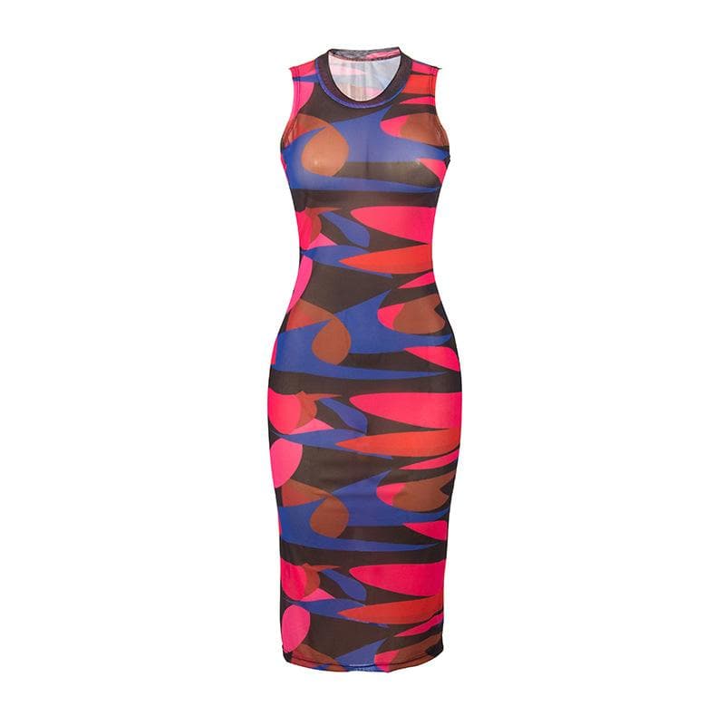 Sleeveless sheer mesh see through contrast print midi dress
