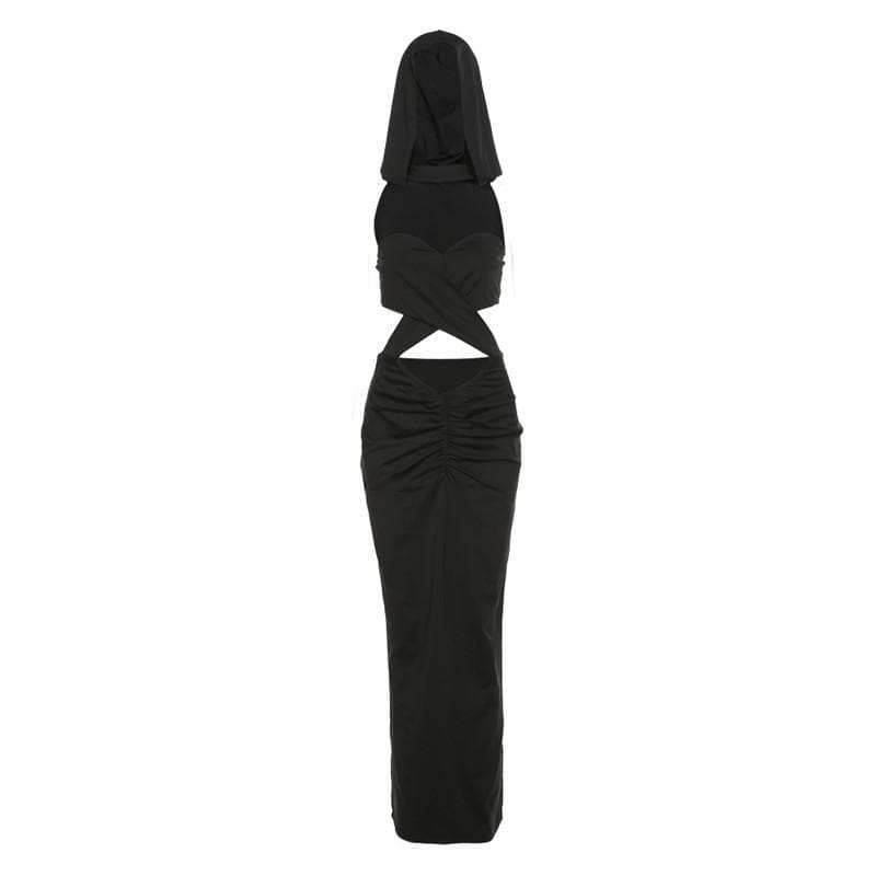 Sleeveless solid hollow out ruched cross front hoodie midi dress