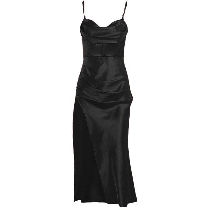 Sleeveless solid satin cowl neck slit backless zip-up cami dress