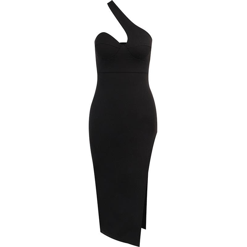 Slit irregular one shoulder solid backless midi dress